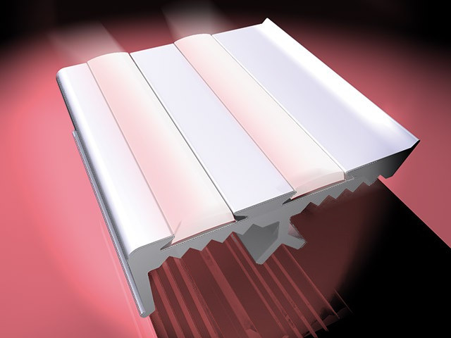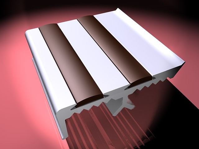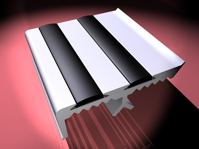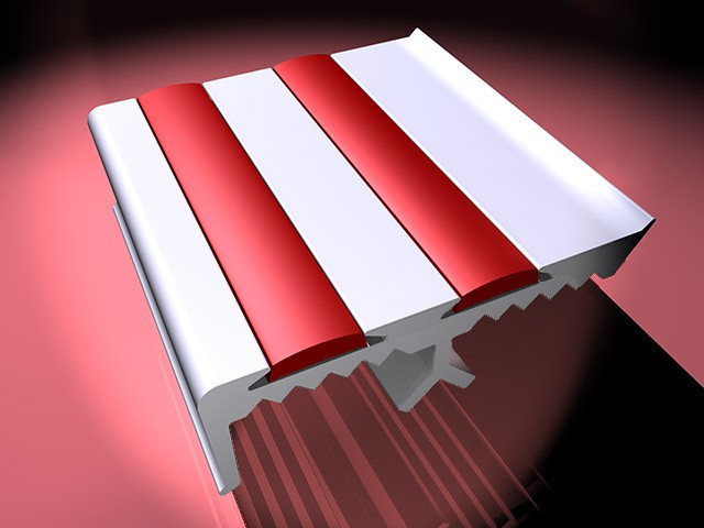 Sicherheits-Profil für Außen-, Industrie- und Betonfertigteiltreppen sowie Estrichstufen. Mit auswechselbaren Gummidämpfern in den Farben Schwarz, Rot, Braun sowie nachleuchtend.