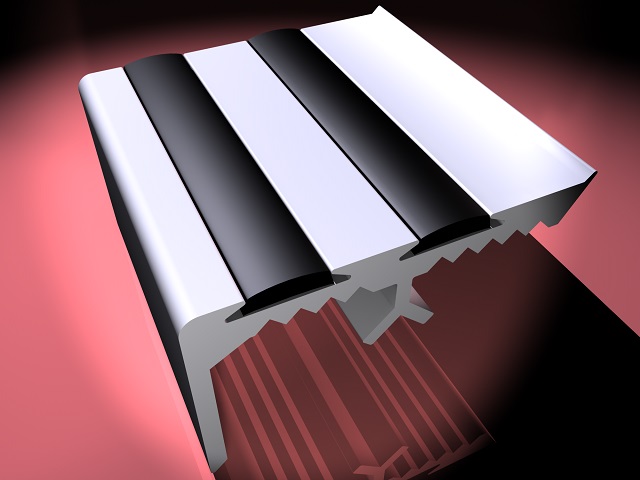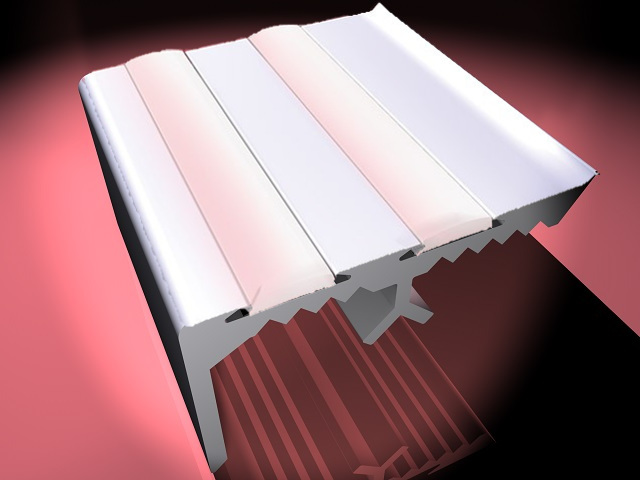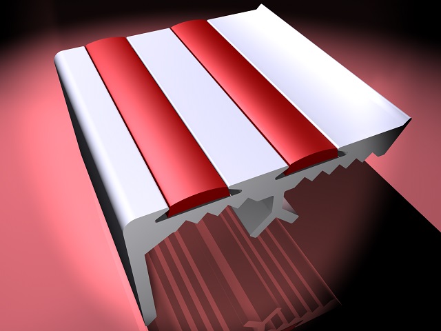 Sicherheits-Profil für Außen-, Industrie- und Betonfertigteiltreppen sowie Estrichstufen. Mit auswechselbaren Gummidämpfern in den Farben Schwarz, Rot, Braun sowie nachleuchtend.