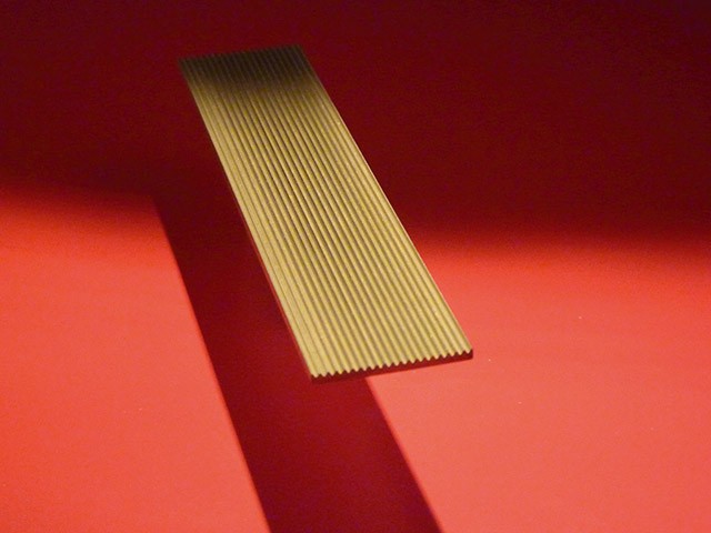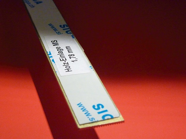 Messing-Feinriffelprofil geeignet zur Einlage in Holzstufen per CNC-Einfräsung. 22,5 mm breit, mit doppelseitigem wasserfestem Klebeband zur Befestigung.